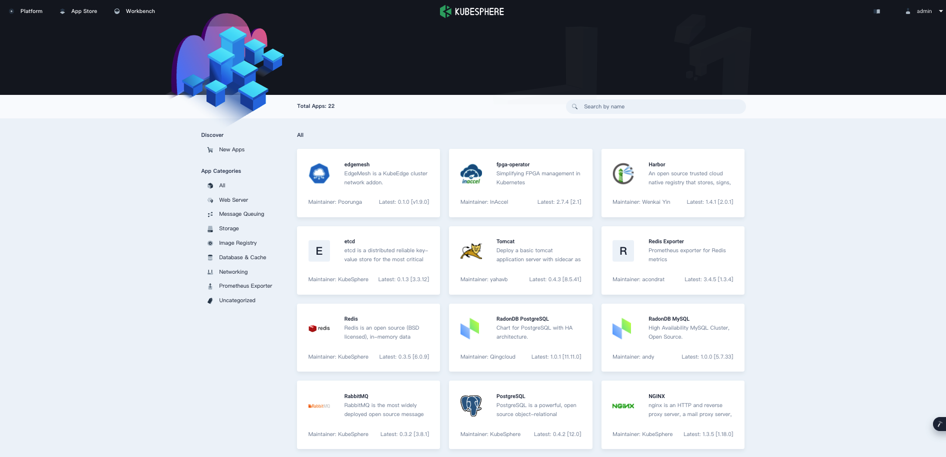 As a distributed operating system for cloud-native application management, KubeSphere realizes application lifecycle management through its pluggable component, App Store. After enabling the App Store, you can deploy the built-in applications on the web console. Moreover, you can upload Helm-based applications or import a Helm repository. With KubeSphere, you can manage your Kubernetes applications throughout their lifecycle, including submission, review, test, release, upgrade, and removal via the console.