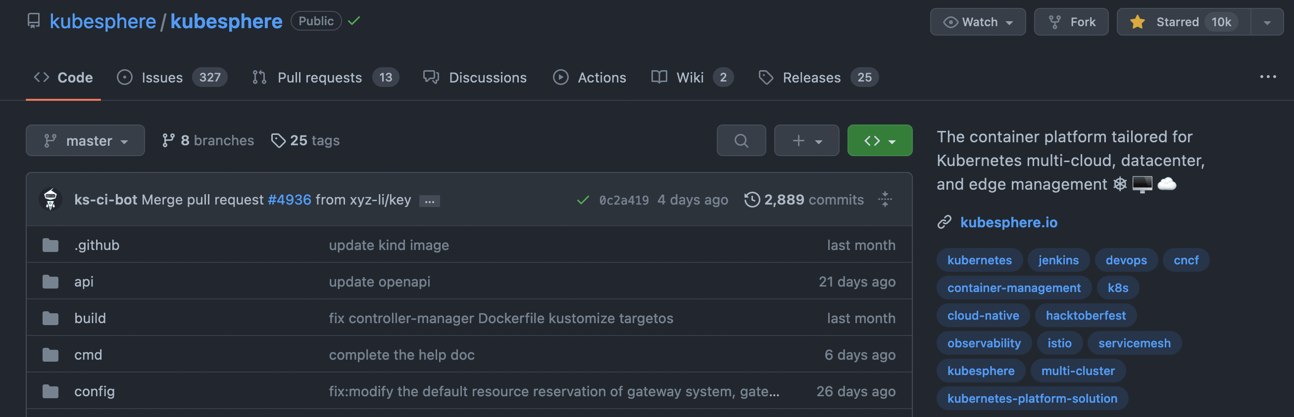 The achievement of 10,000 GitHub stars has tremendous implications for KubeSphere, which marks that KubeSphere has transformed into the only world-influential open source container platform initiated by a Chinese company, despite all difficulties and hazards during the whole process.